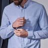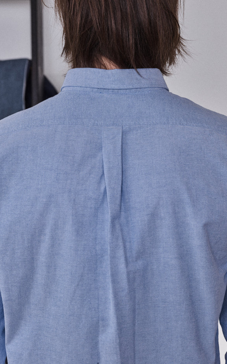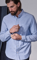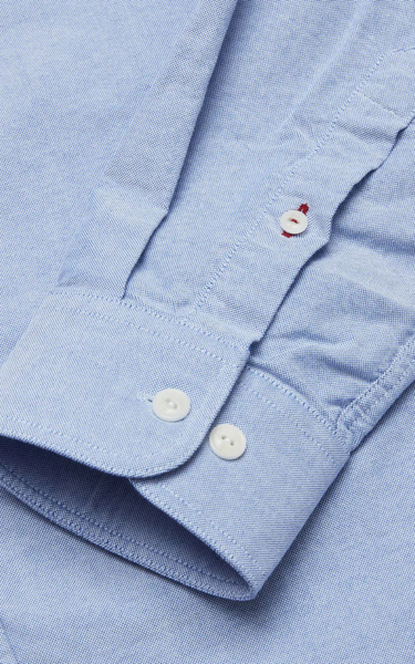 Dette er en klassisk button-down skjorte med brystlomme, diskret logo-broderi under lommen, buet søm og knapper fremstillet af corozo-nød – en naturlig og holdbar detalje.