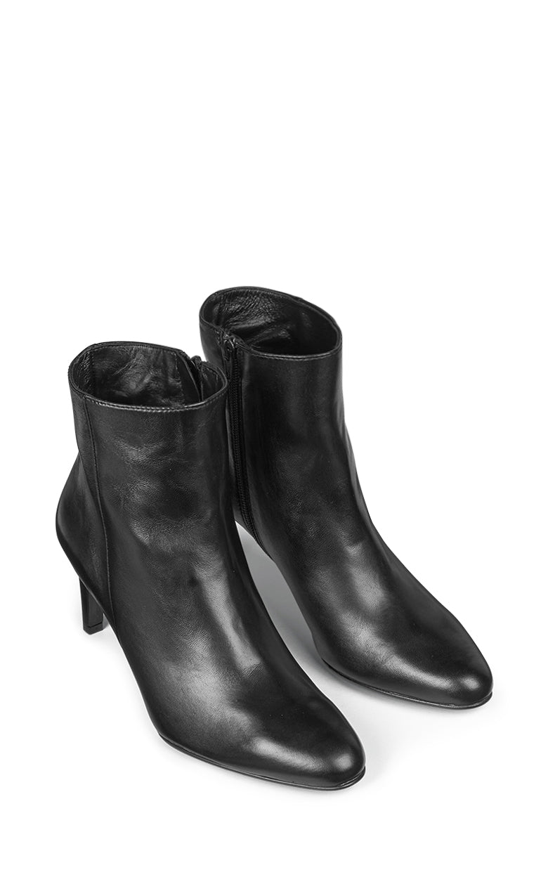 Tidløs og elegant ankelstøvle i glat sort skind med smal, feminin silhuet og høj stilethæl. Designet er enkelt og sofistikeret – perfekt til både jeans, kjoler og businesslook. Støvlen har lynlås på indersiden og læderfor, som giver en behagelig pasform og et eksklusivt udtryk.