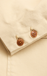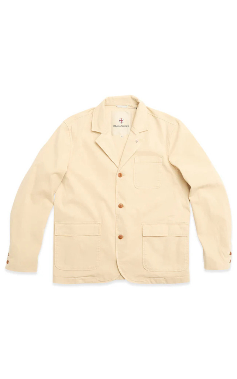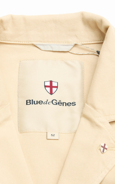 Tone-i-tone syninger fremhæver det rene look, mens den karakteristiske Blue de Gênes flag-rivet ved reverset tilføjer et eksklusivt signaturpræg. Knapper af naturlig corozo-logo fuldender designet med subtil elegance, og indvendige dækkede sømme sikrer en holdbar og gennemført konstruktion.
