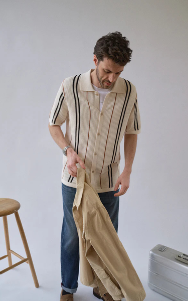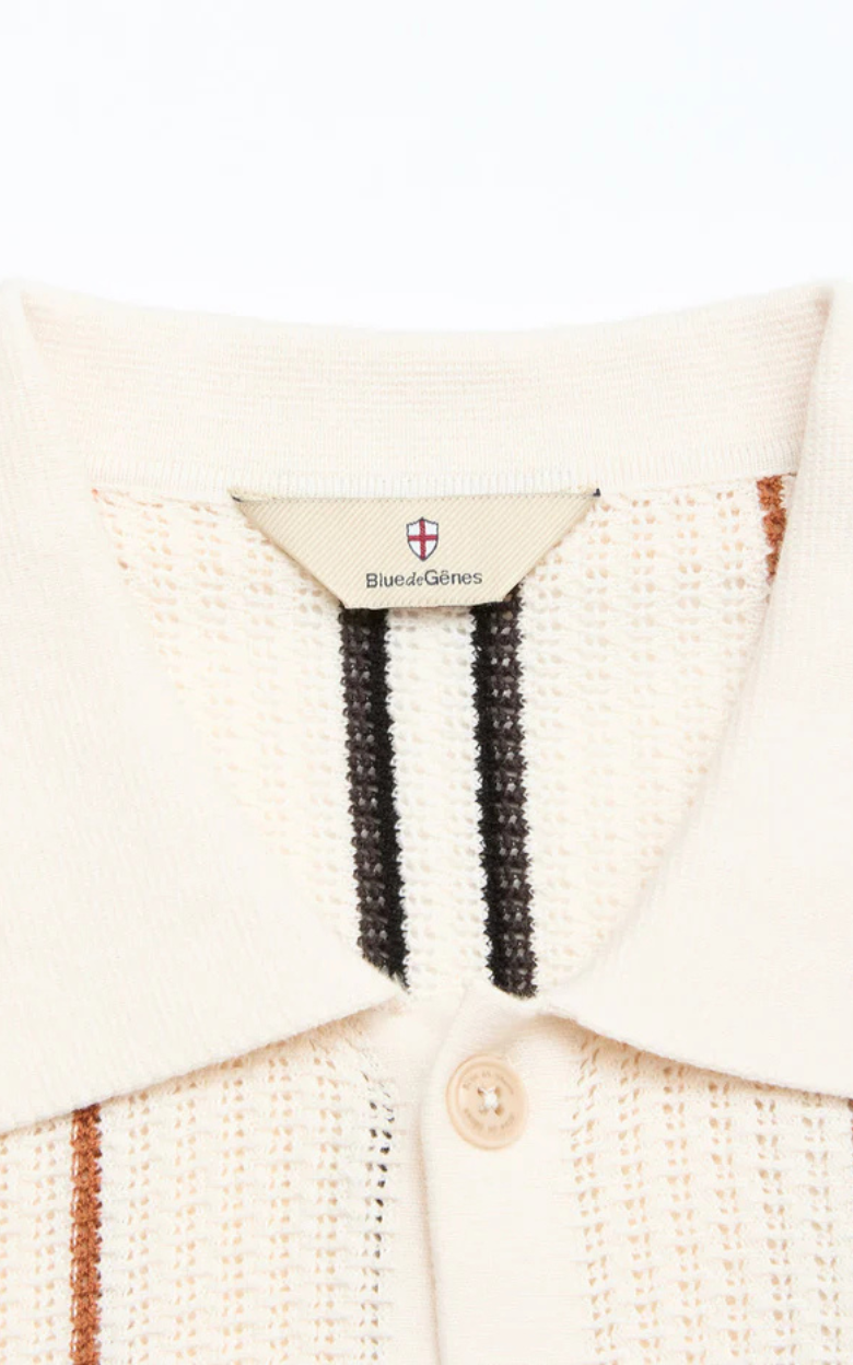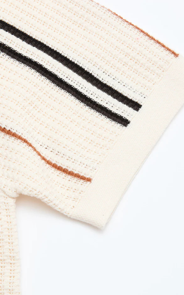 En tidløs klassiker med moderne twist. Kortærmet strikket cardigan i blød 100% bomuld, som giver åndbar komfort og en naturlig blød fornemmelse mod huden. Cardiganen er udført med et dekorativt lace-strikmønster og kontraststriber, hvilket kombinerer vintage-inspireret charme med en ren, moderne silhuet.