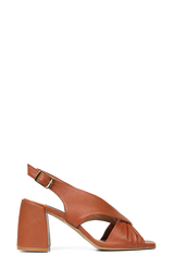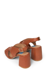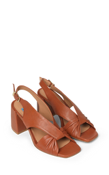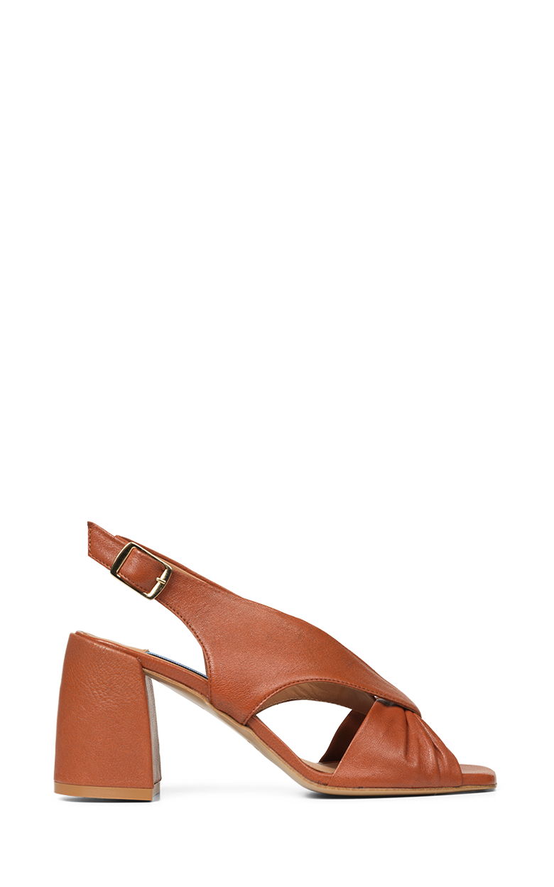 Elegant sandal i blødt, karamel farvet skind med en feminin knudedetalje foran. Den åbne silhuet kombineret med den stabile blokhæl giver et let og sofistikeret udtryk, mens den justerbare rem med guldspænde sikrer en elegant finish. Perfekt til både sommerfester, bryllupper og lyse hverdagslooks.