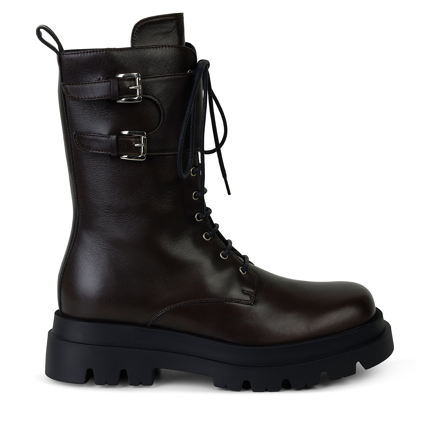 Chunky støvler i mørk brun glat læder, med to spænde lukninger og snører lukning foran, firkantet snude g sort chunky sale.