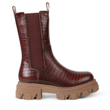 Vi ELSKER disse Chunky støvler! Med glat mørkbrun skind i et crocco mønster, mørkbrun elastik på begge sider og en smuk lys chunky cognac farvet sål.