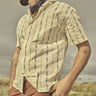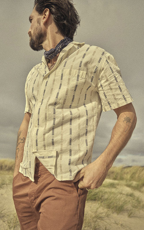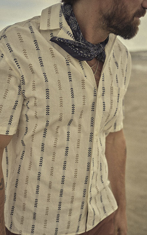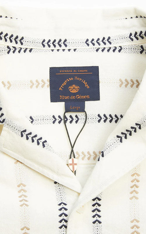 Colonnello Otto Shirt, der er fremstillet i en garnfarvet jacquardstribe, er en dejlig sommerskjorte lavet i 100% bomuld. Normal pasform, 5,6 oz stof i en unik farvevariant, der kun er tilgængelig for Blue de Gênes, logobroderi under brystlommen og knapper lavet af corozo-nød.