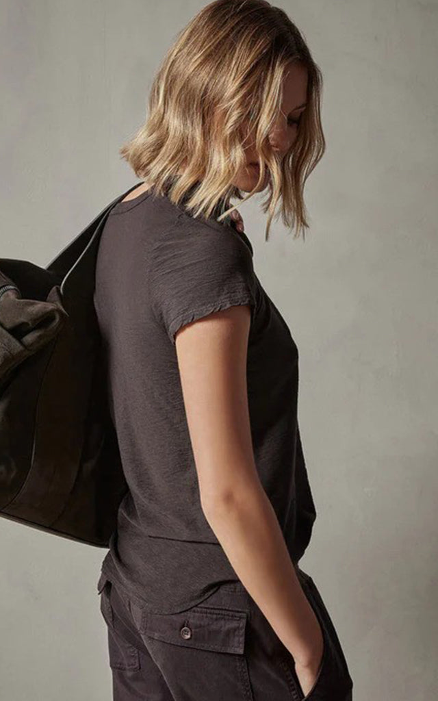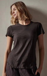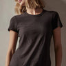 Denne mørkebrune T-shirt er lavet i 100% bomuldsslub. Stylen er monteret på kroppen med en rund halsudskæring og en buet forneden. Beklædningsgenstand farvet i ekstra blødgøringsmidler for en blød indlevet følelse.