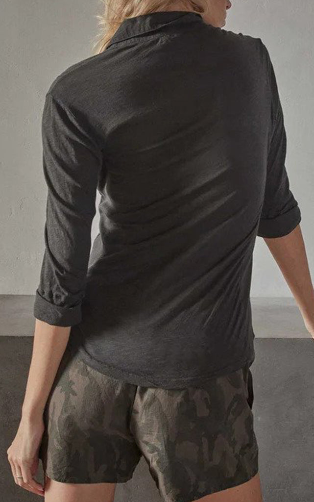 Mørkegrå - CRN skjorte er lavet af 100% bomuld. Denne stil bruger bagsiden af stoffet for ekstra tekstur og har kontrasterende ribpaneler på siderne og ærmerne. Stylen har krave, knaplukning foran, to brystlommer foran og buet kant.