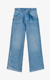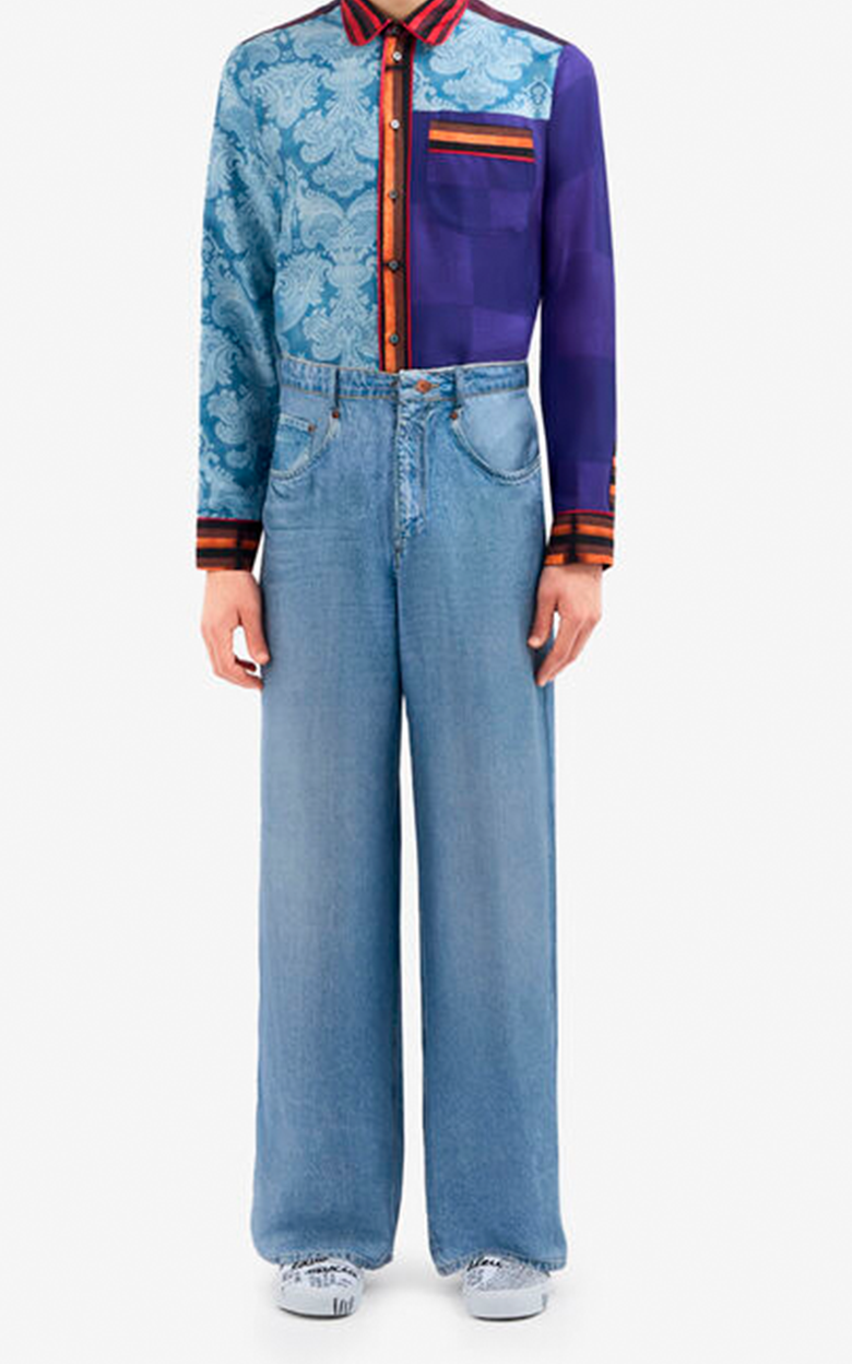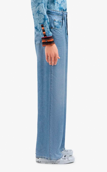 Cool og smukke silke bukser lavet så de ligner jeans. Knap og jeans-møster er printet på, de fem klassiske jeans lommer er rigtige lommer.