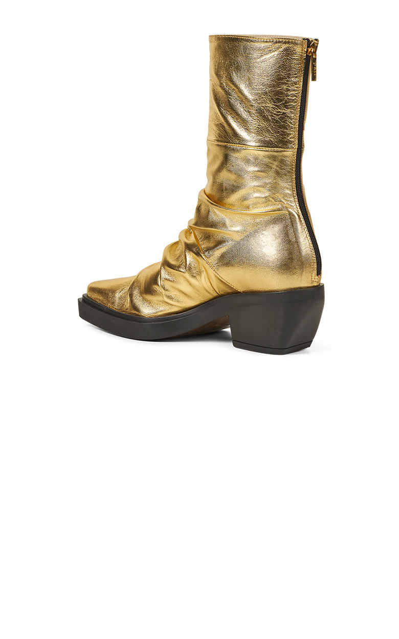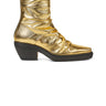 Denne vilde cowboysko er noget helt særligt. Den er lavet i det fedeste guldmateriale og har små flag i designet for et ekstra udtryksfuldt look. Med en hæl på 6,5 cm og en praktisk lynlås bagpå er denne sko både stilfuld og unik. Det er det perfekte valg for dem, der ønsker at skille sig ud fra mængden.