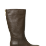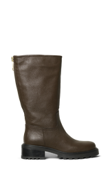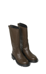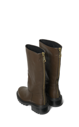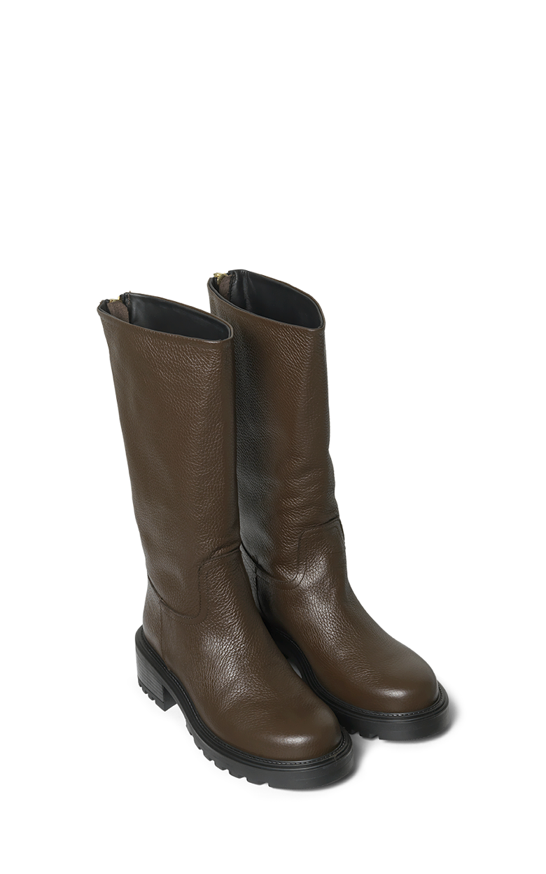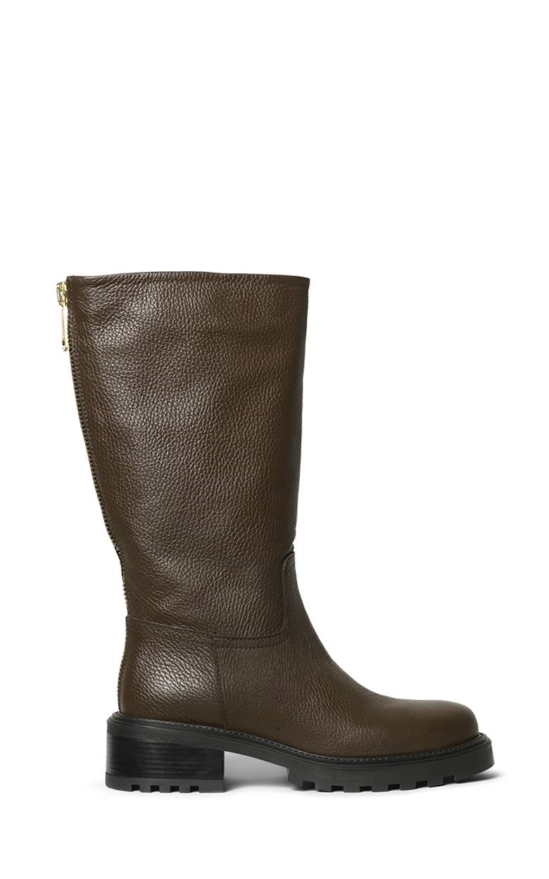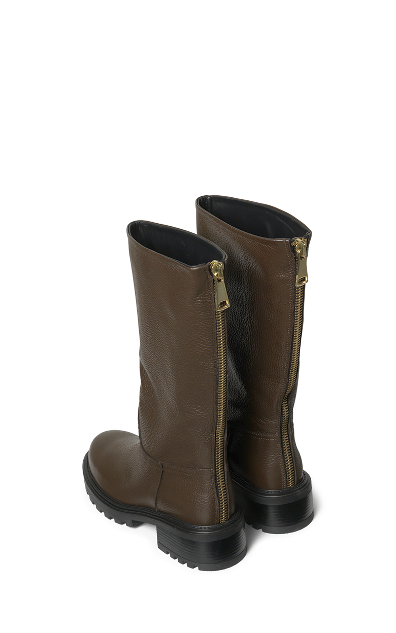 Smukke medi lange støvler i brun kalveskind af typen buffalo og med en smuk bred guld lynlås bagpå skaftet. Buffalo har en mere nubrede overfladestruktur, hvilket både giver støvlerne et mere råt og eksklusivt look.
