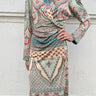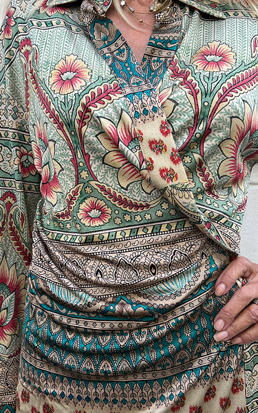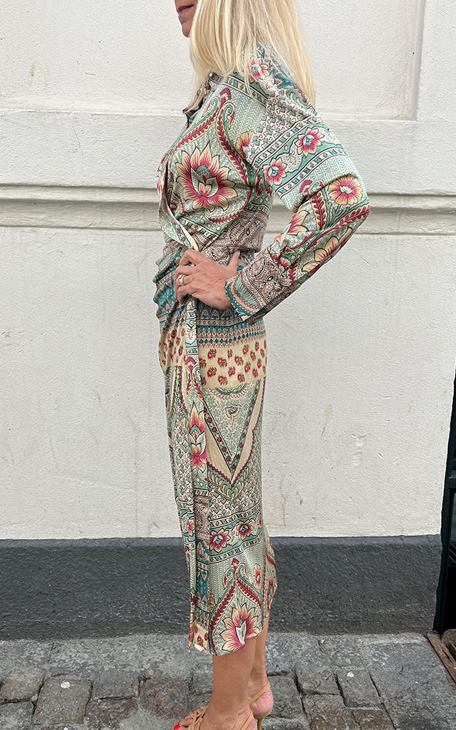 Fantastisk lang silkekjole med strech med masser af smukke detaljer som blomster, i skønne farver. Har V-udskæring og klæder kroppen smukt.
