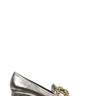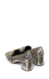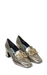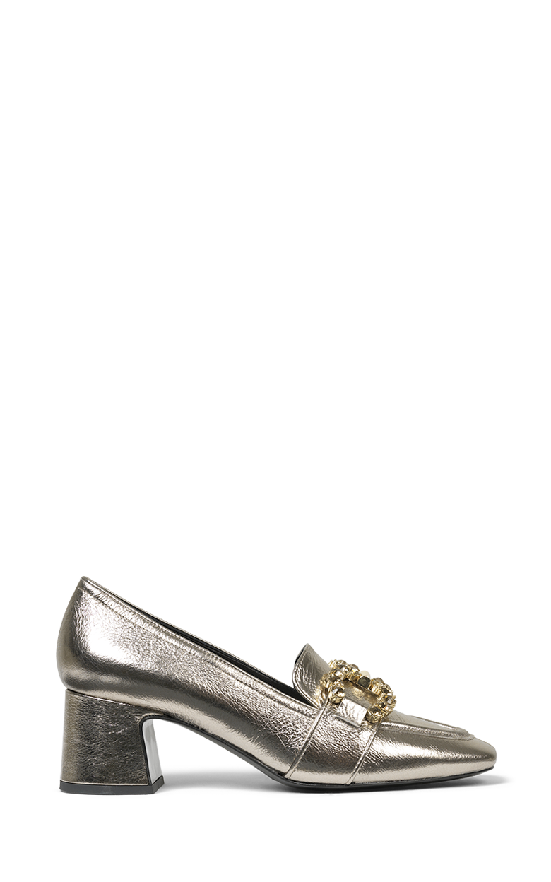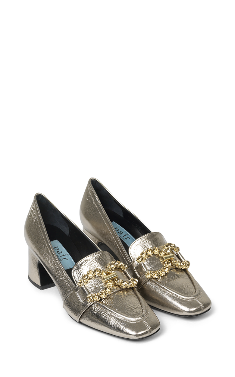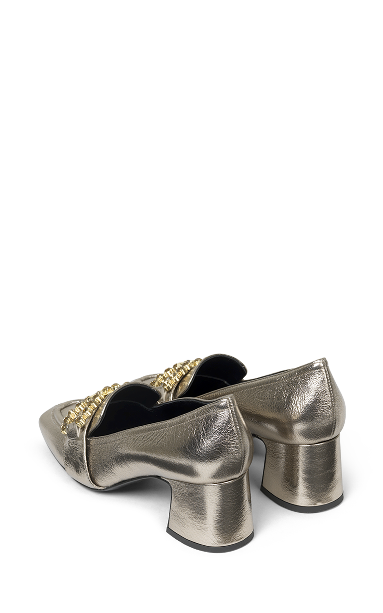 En smuk guld metallisk loafer med en chunky hæl, dekoreret med et spænde af pynte sten. Kalveskindet har fået en metallisk finish der giver skoen et luksuriøst look. Et festligt og sofistikeret tolkning på en klassisk loafer med hæl.