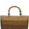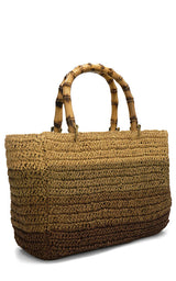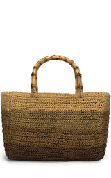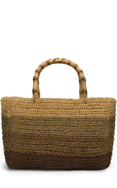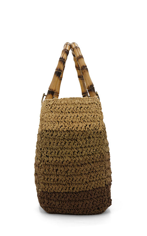 Smuk håndlavet shopper/flettaske i fantastisk natur og brunlige skiftende nuancer. Indvendigt er der et stort rum, en sidelomme med lynlås og to små åbne sidelommer – og lynlåslukning.