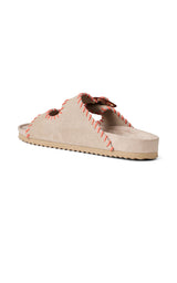 En praktisk, men cool sandal til der kan spice et outfit op! Det dobbelte ruskindsbånd har gennemsigtige spænder med en farvet ramme og kontrastsyninger. Sandalerne har en lækker kvalitet ruskind og fantastisk pasform.