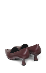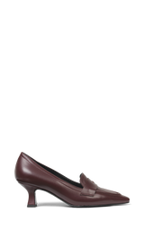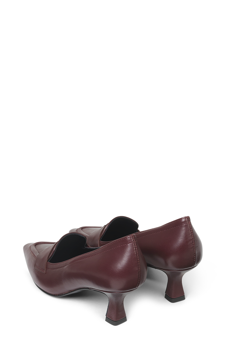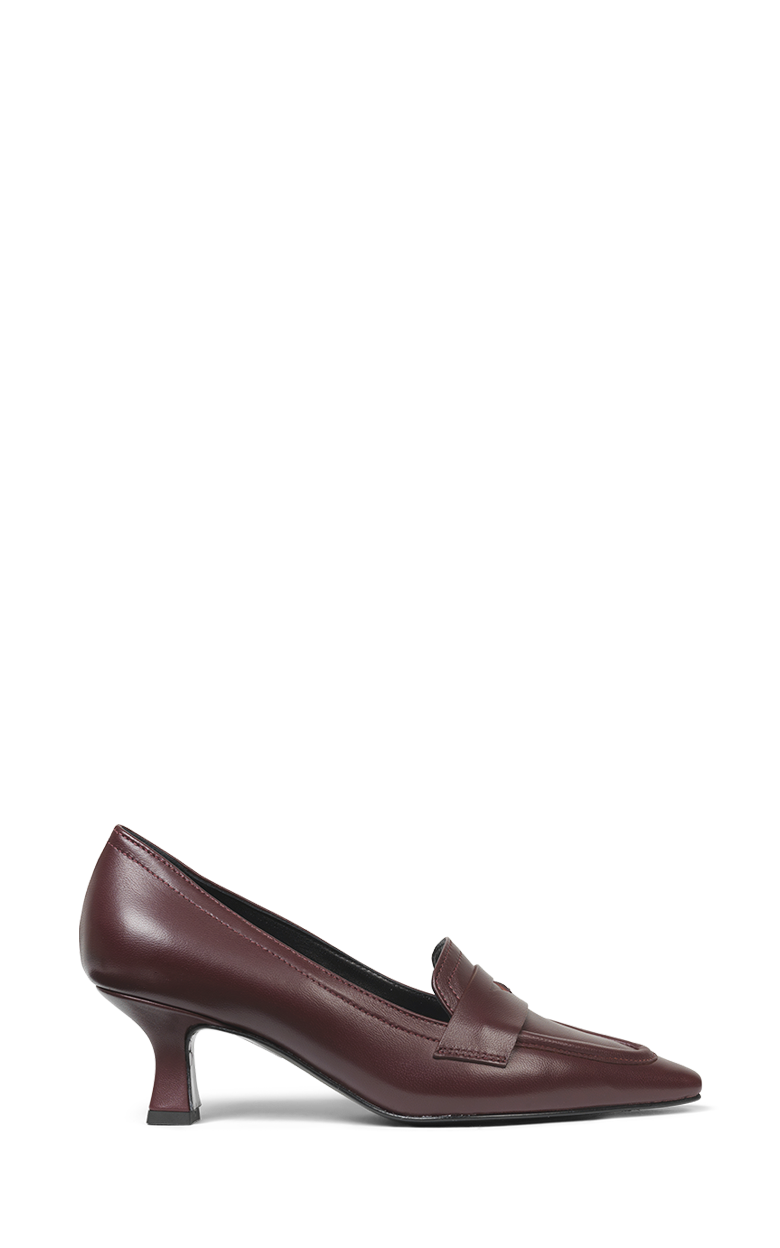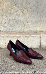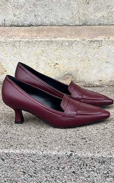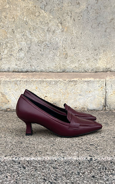 Cool loafer på hæl i den smukkeste bordeaux farve. En elegant og klassisk sko, der har god komfort og nem at style til ethvert outfit. Denne loafer er lavet i lækker kalveskind fra Italien.