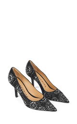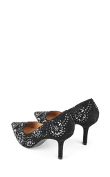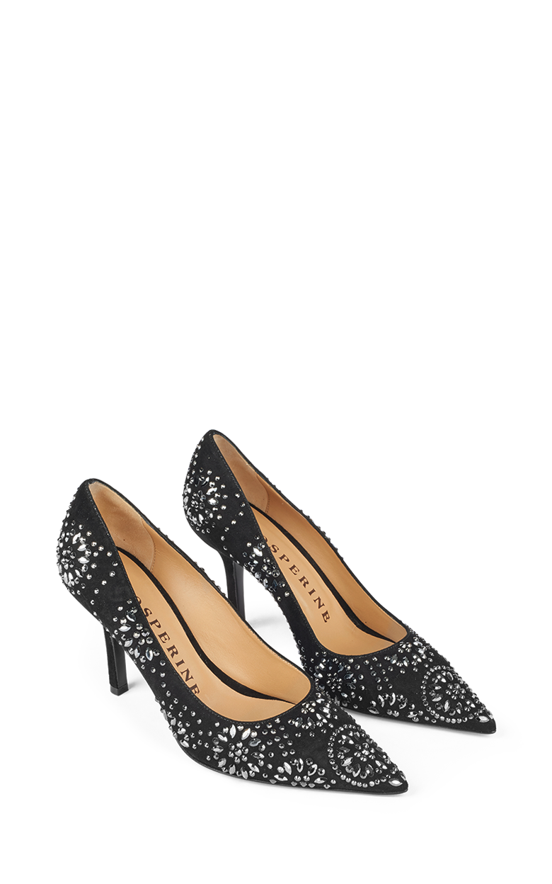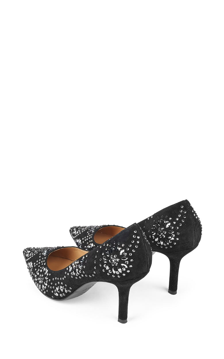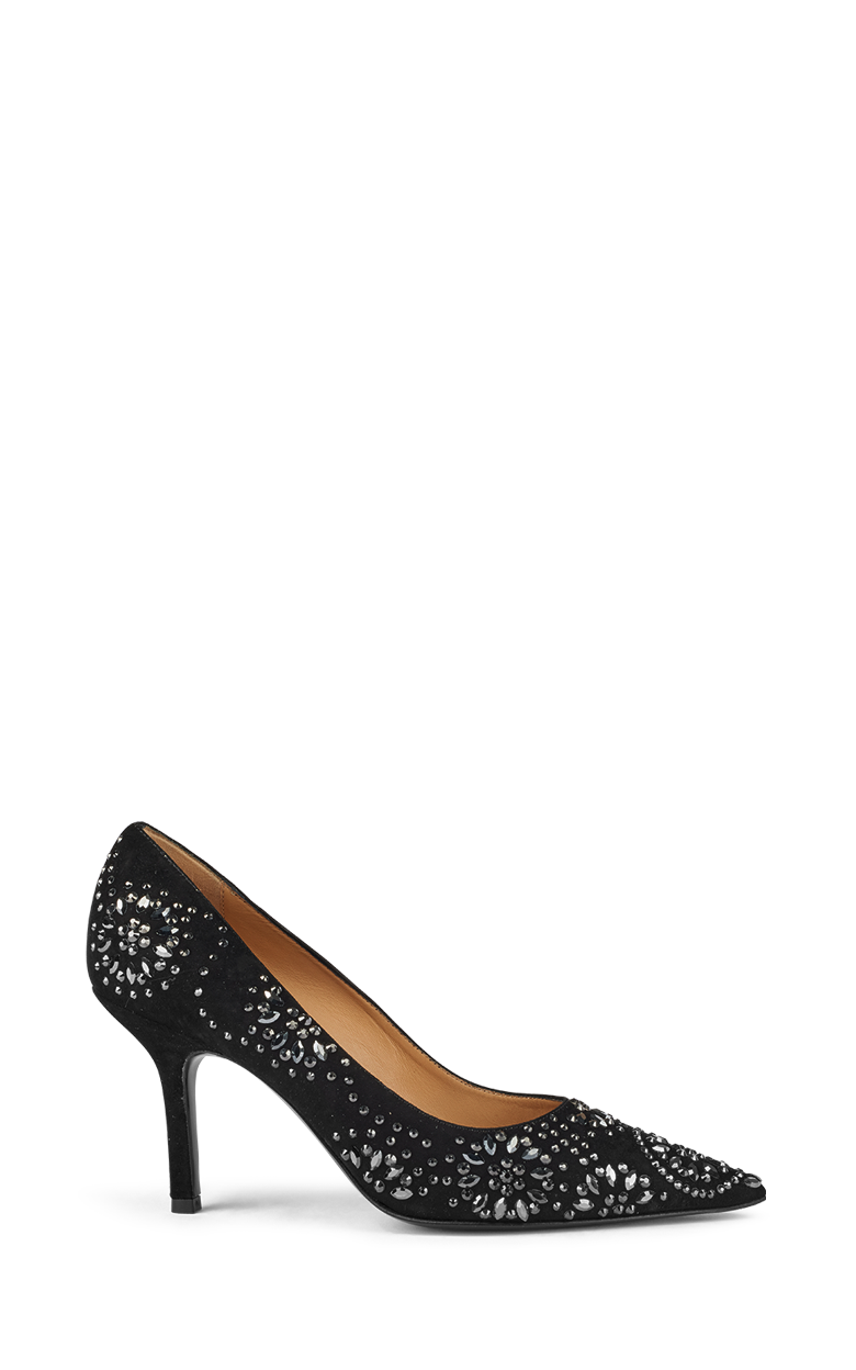 Elegant pump i sort ruskind med funklende krystaller arrangeret i smukke mønstre. Den spidse snude og den slanke hæl skaber et feminint og sofistikeret look – perfekt til aftener med stil, festlige lejligheder eller som luksuriøst supplement til den lille sorte.