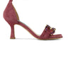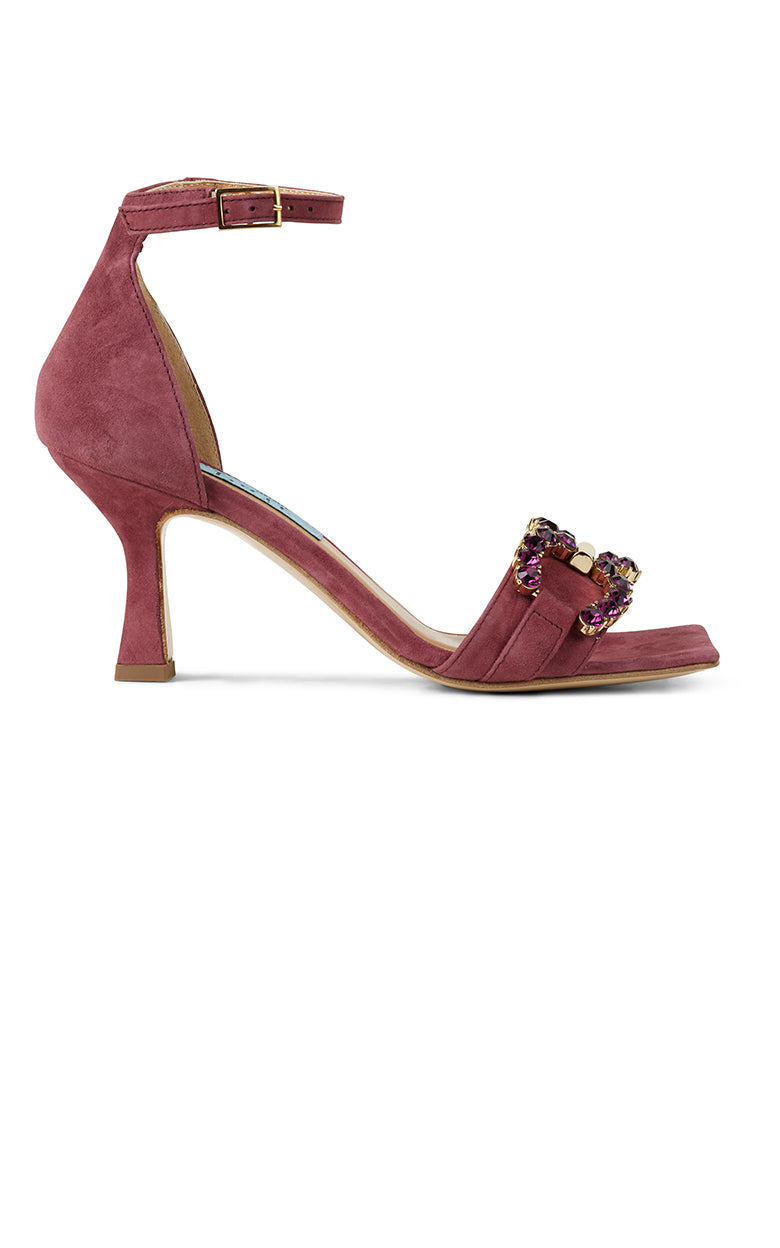 Denne smukke og festlige sandal har en hæl på 8 cm. Den har en firkantet åben snude, er lavet i bordeaux/lilla ruskind og har et flot spænde med lilla sten på.