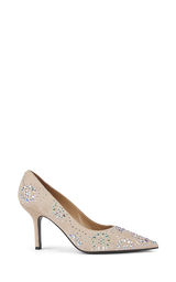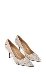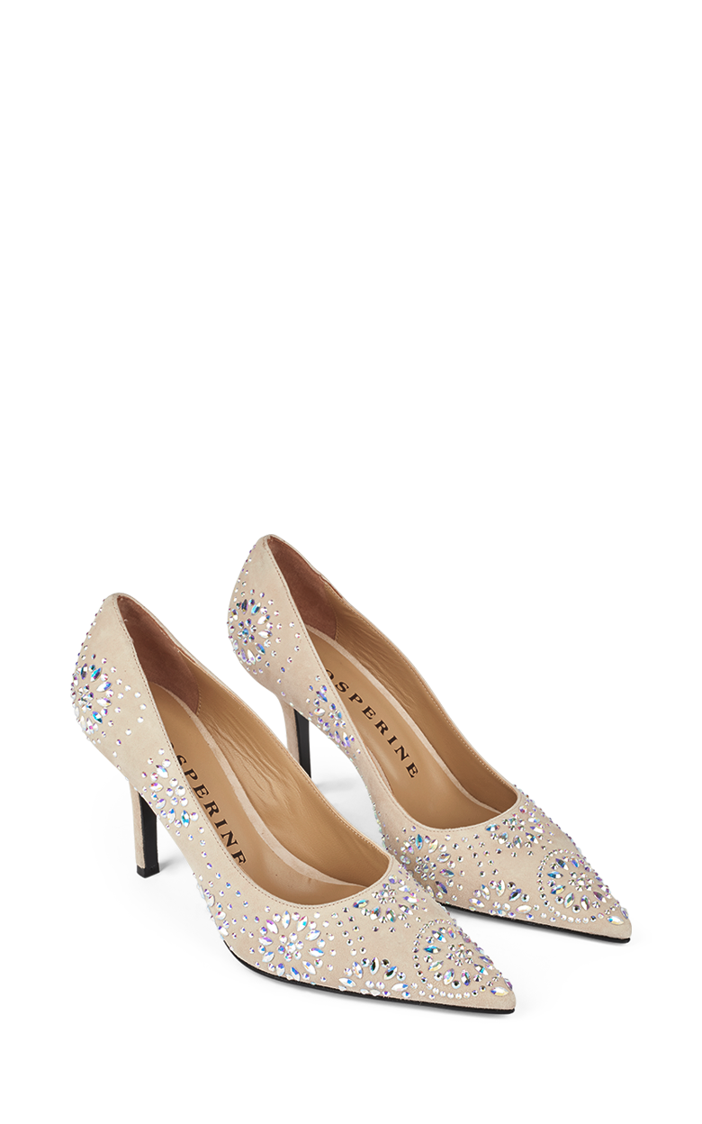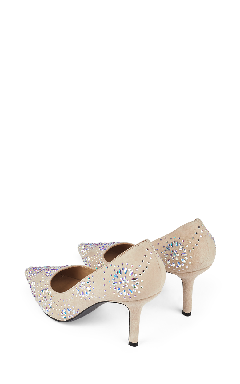 Glamourøse pumps dækket med funklende krystaller i forskellige størrelser og mønstre, der giver et eksklusivt og iøjnefaldende look. Den spidse snude og den elegante stilet hæl løfter ethvert outfit – perfekte til festlige lejligheder, gallaaftener eller som et stilfuldt blikfang til brylluppet.