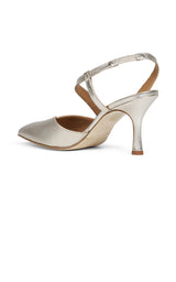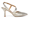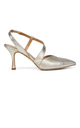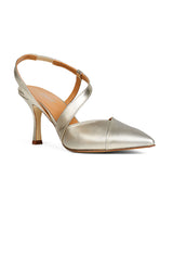 Smukke guldstilletter med asymmetrisk/diagonal rem over foden, spids snude og 8 cm hæl. Perfekt til alle forårets og sommerens begivenheder.