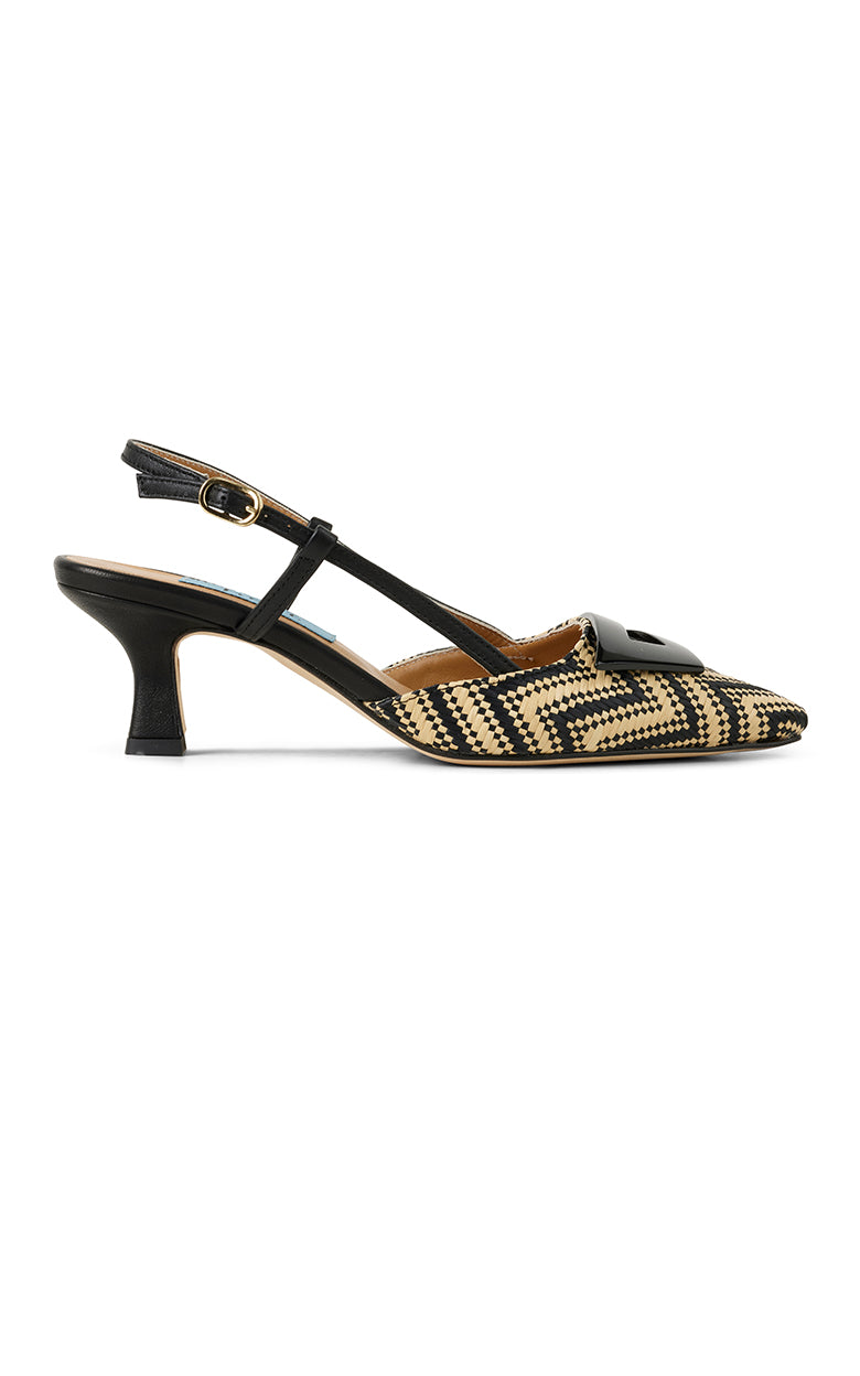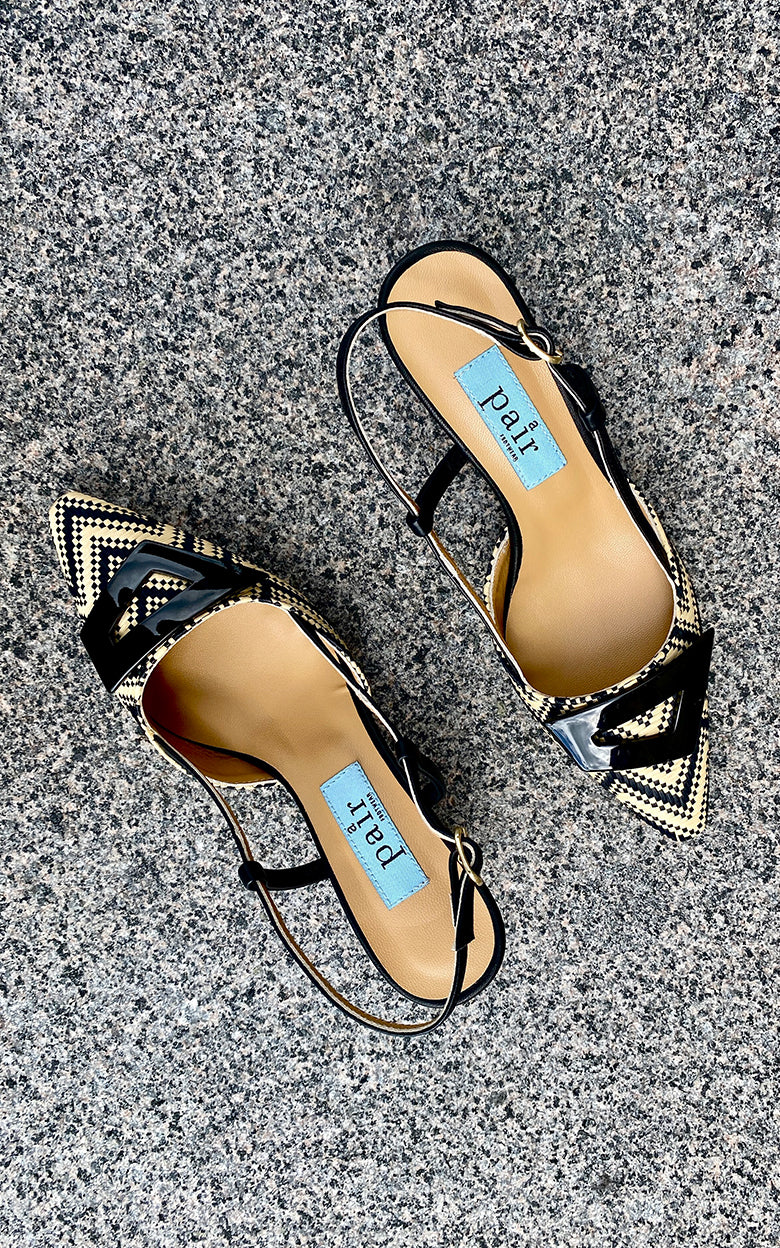 Bliv klar til at se sommerlig og cool ud i disse skønne stiletter - lavet i sort skind med et flot mønster i rattan i sort og creme. Derudover pynter det store sorte asymetiske spænde ligeledes foran på skoene.