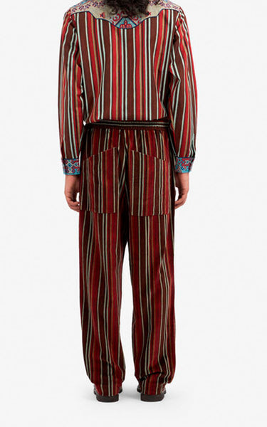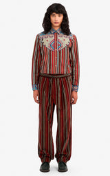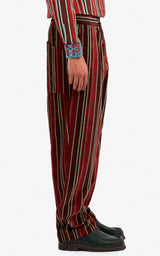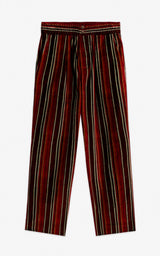 Super cool stribede velour bukser med elastik, to knapper og lynlås i livet. Lavet i skønne røde og brune efterårsfarver.