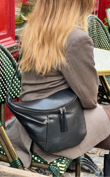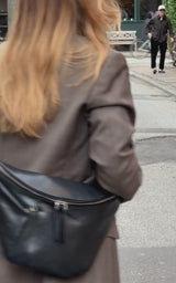 Taksen har en sort lynlås lomme på forsiden og en lille ekstra lomme. Den har en justerbar rem, så tasken både kan bruges som skuldertaske eller crossbody. Den har en flad bagside, hvilket gør at tasken lægger sig pænt til kroppen når der bæres crossbody.