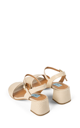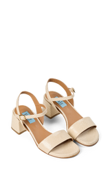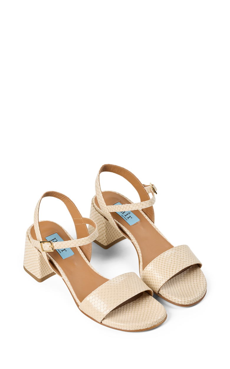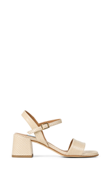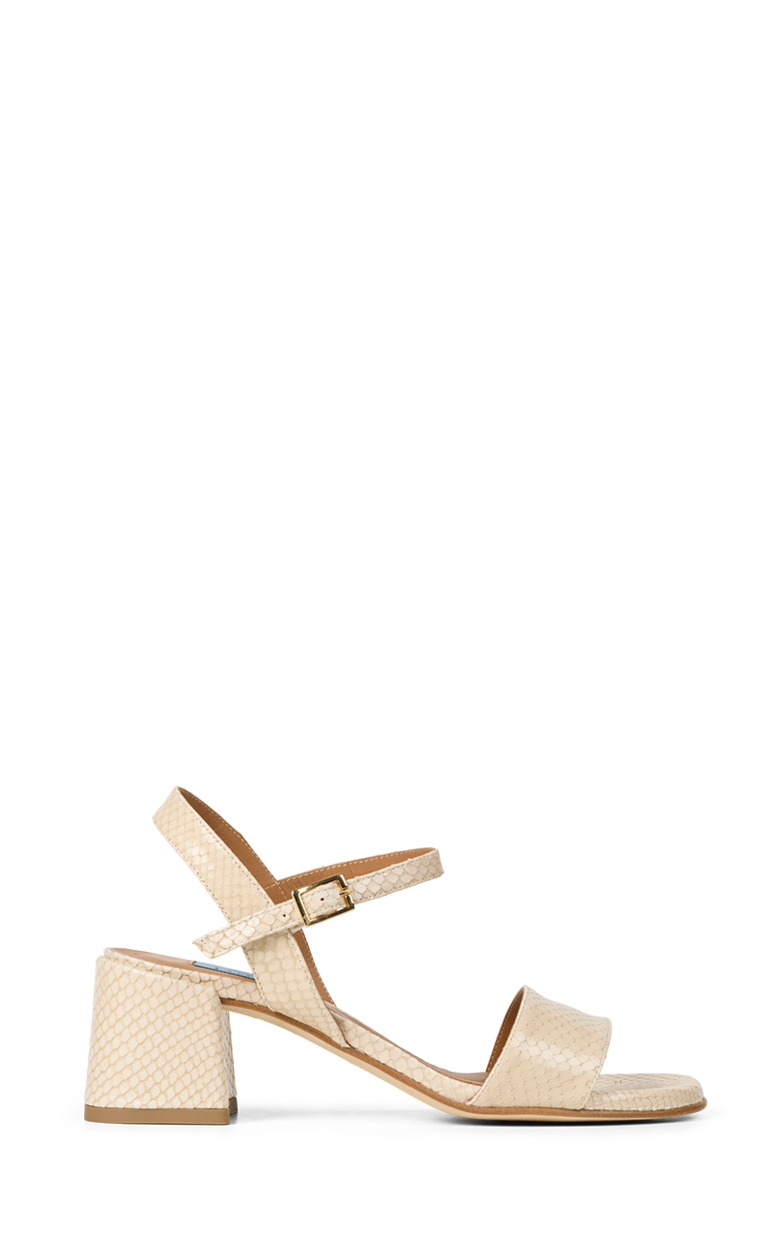 Elegant sandal i lyst læder med præget struktur, der giver et eksklusivt og raffineret udtryk. Den brede frontrem, justerbare ankelrem og stabile blokhæl skaber en feminin silhuet med god komfort. En stilfuld sandal der er nem at style til både sommerkjoler, festlige anledninger og elegante hverdagslooks.