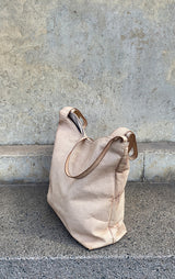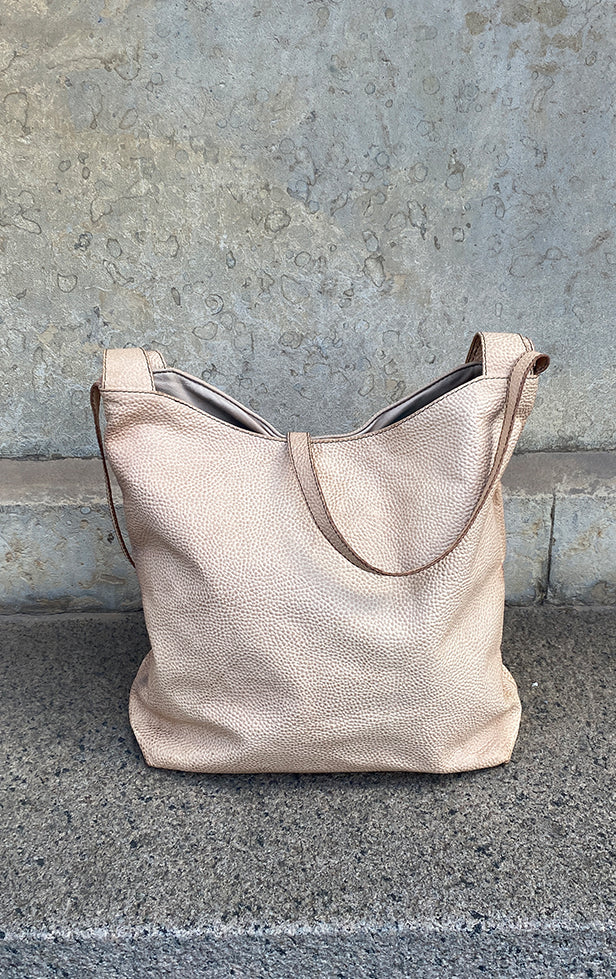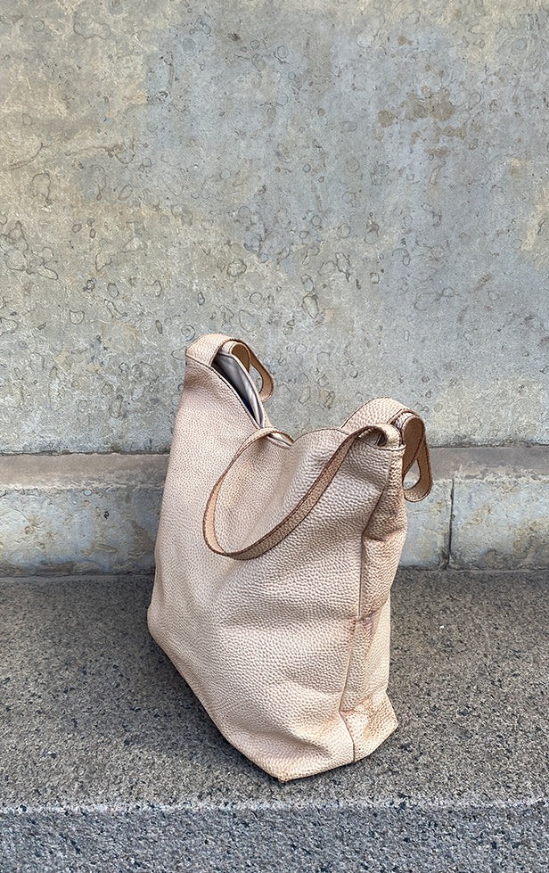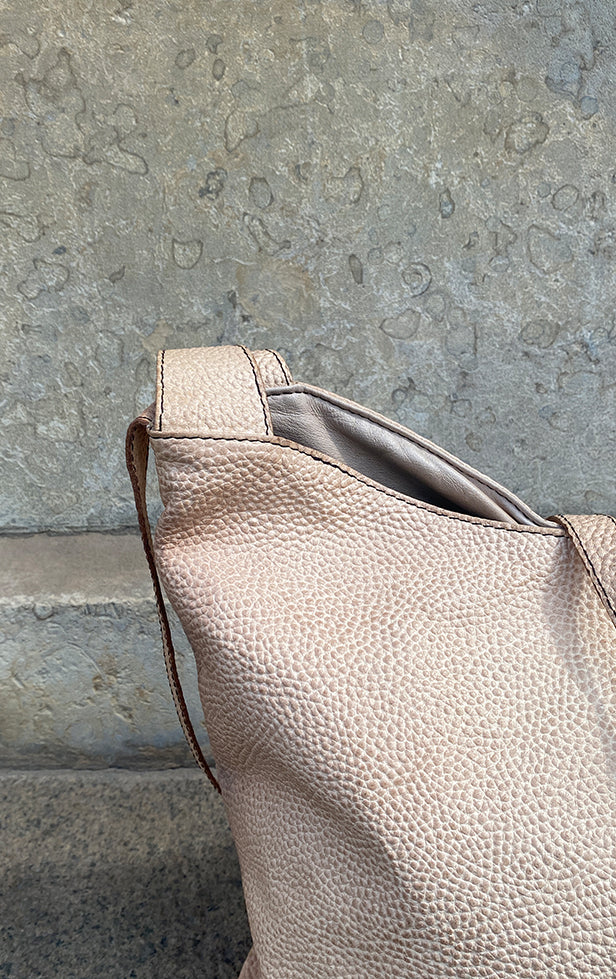 Lækker lys Vancouver taske i læder fra Numero10 i en revnet æggeskal farve. Med en tekstureret stil, tophåndtag, en justerbar skulderrem og en midterknap. Lavet i Italien.