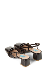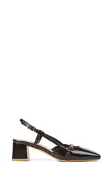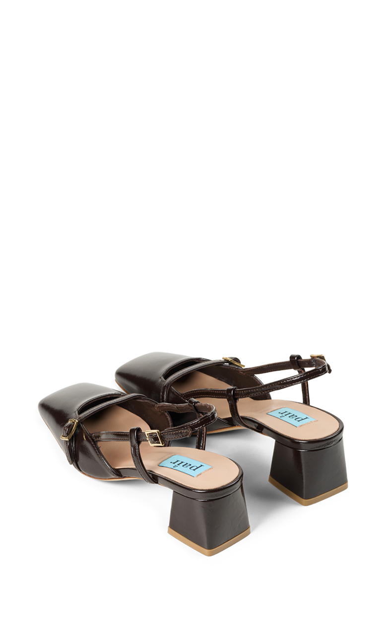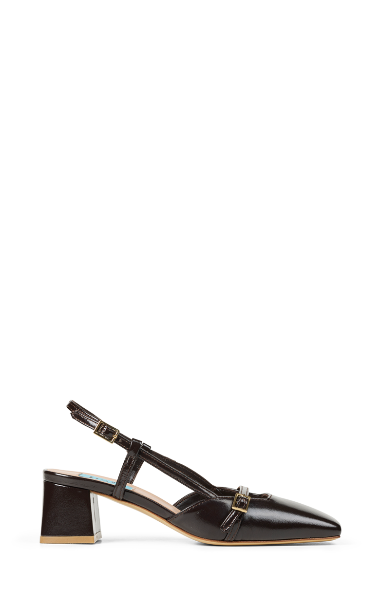 Elegant slingback i blankt mørkebrunt læder med en raffineret og moderne silhuet. Den firkantede snude og de fine remdetaljer med små spænder giver skoen et feminint og sofistikeret udtryk, mens den stabile blokhæl sikrer komfort hele dagen. En stilfuld sko der fungerer perfekt til både arbejde, middage og særlige anledninger.