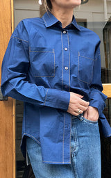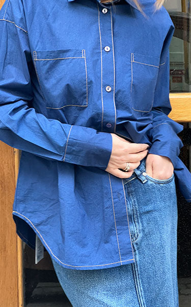 Flot skjorte fra Luna Moon i mørk klar blå med cool gule syninger. Skjorten er lavet i et klassisk oversize skjorte fit og har to forlommer på brystet.