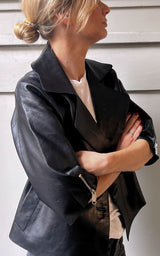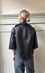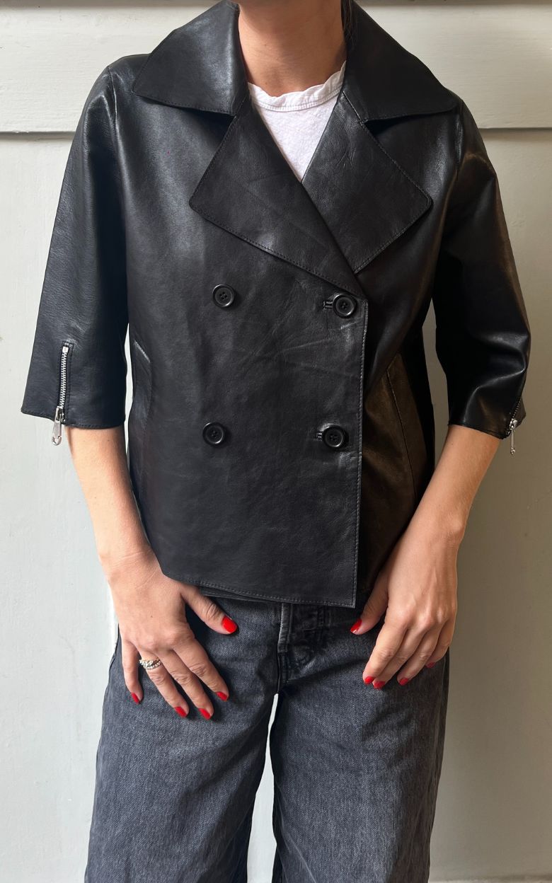 En kort trenchjacket i blødt lækkert skind. Jakken har dobbelt knapper som lukning og er detaljeret med flotte lynlåse på ærmerne. Jakke har 3/4 ærmer, hvilket giver den er let look.