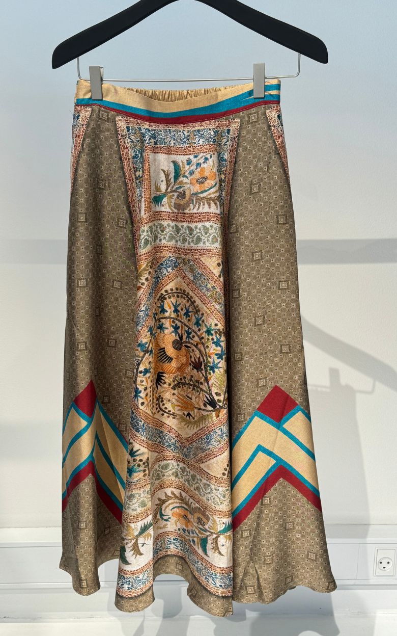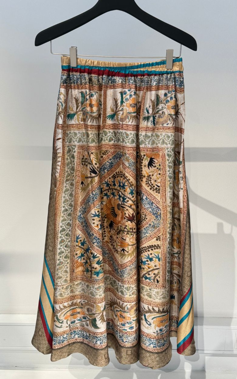 En smuk A-formet medi nederdel, der kombinerer elegance og komfort. Nederdelen er lavet i 100% silke og har et sukt livligt print. Den lette og luftige silke giver en fantastisk fornemmelse på huden, mens den A-formede pasform giver et feminint og flatterende udtryk. Nedersdelen har elastik på bag bagstykket.