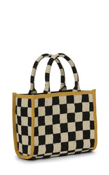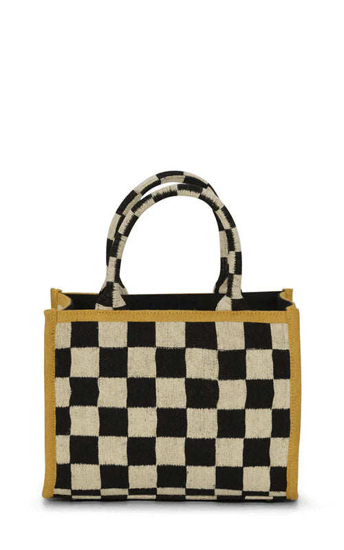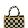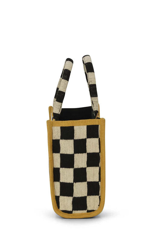 Super cool vævet taske lavet af 60% bomuld og 40% jute. Foret er lavet af 100% bomuld. Indvendigt finder du 3 lommer – en af dem lukkes med lynlås. Sorte og hvide firkanter og et støvet gult bånd rundt om kanterne.
