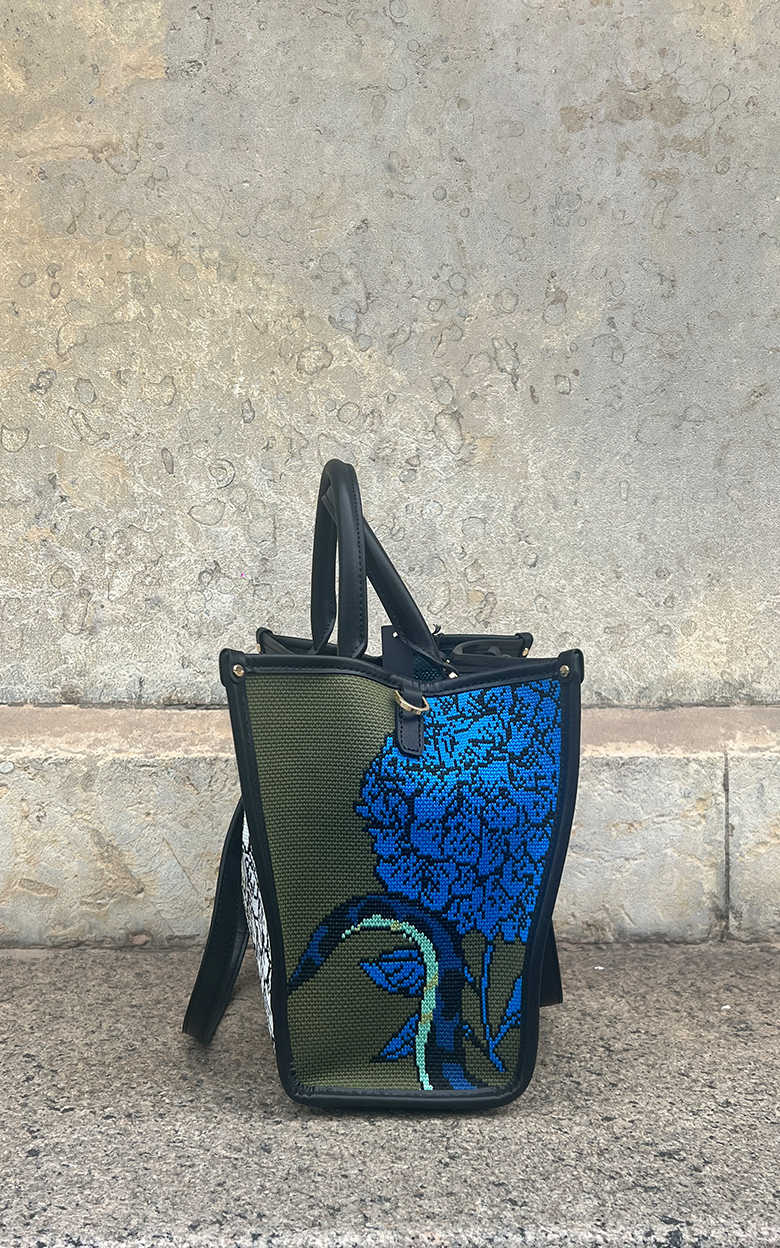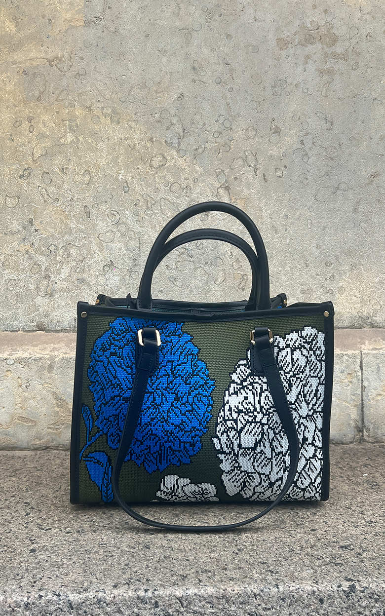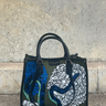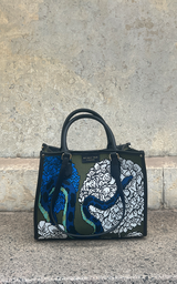 Cool lærreds taske i smukt print og lækre farver. Tasken har dobbelt hank i forskellige længder og ydermere medfølgende bred læderstrop så den kan bruges "crossover". Produceret og designet i Italien.