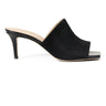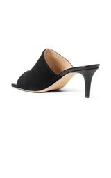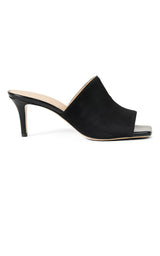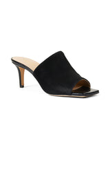 Smukke sorte slip in's med såler og hæl i glat skind og den brede rem i ruskind. De har firkantet snude og 7 cm hæl.