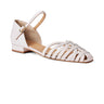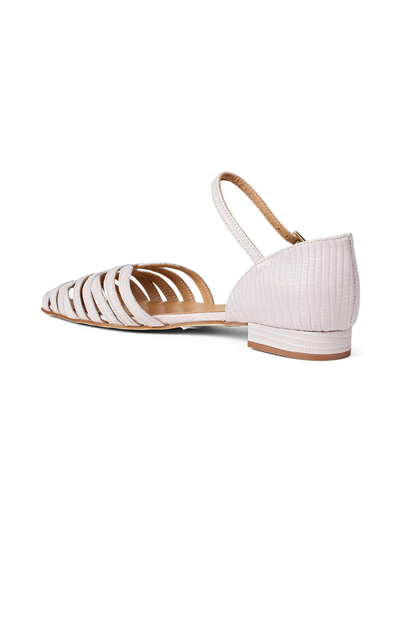 En klassiker er tilbage - i en ny farve. De flotteste flade sko i præget skind i lys rosa. De krydsende remme foran på skoene, danner et super flot mønster.
