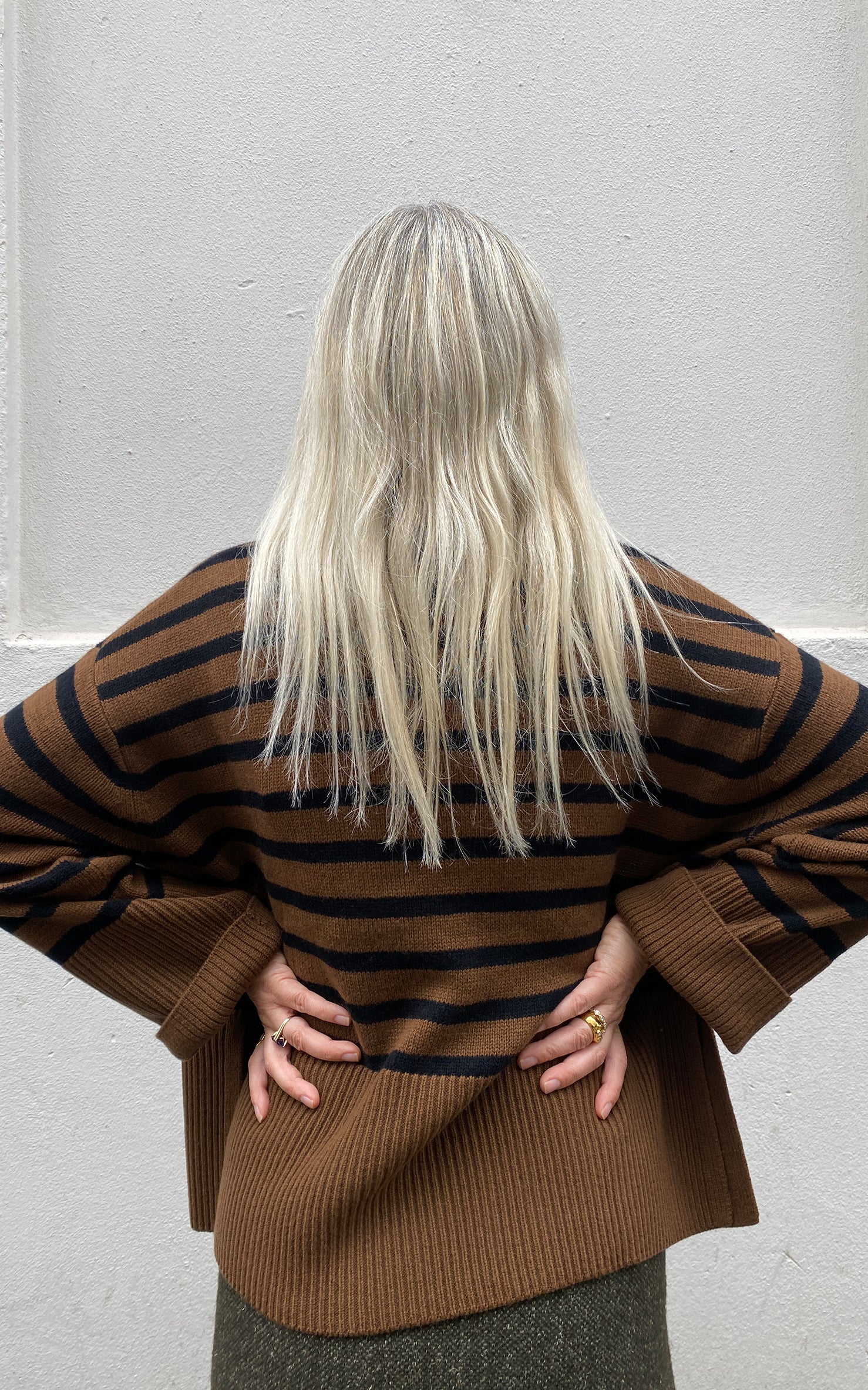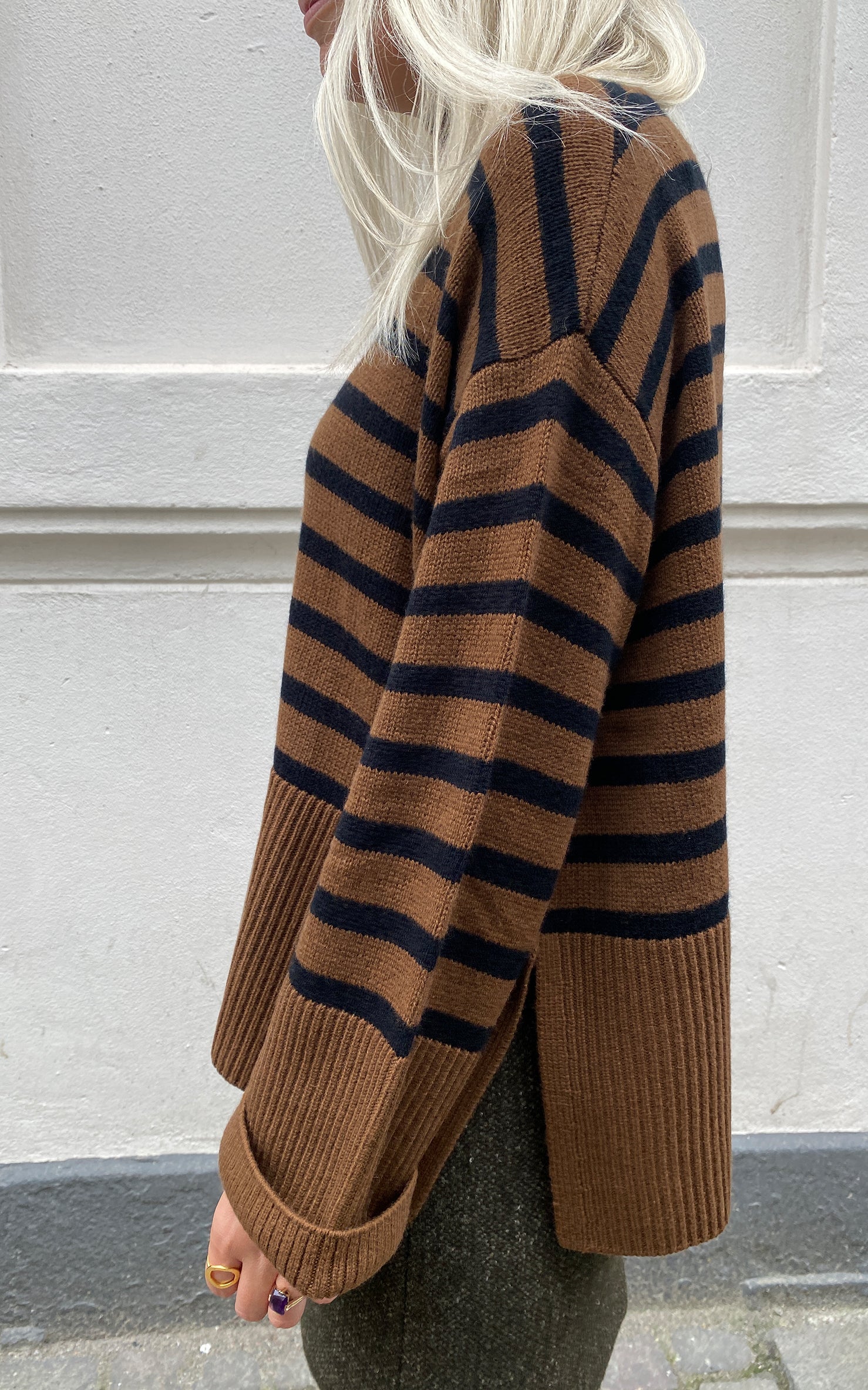 En blød og cool 100% cashmere striktrøje fra Allude, der holder dig varm og stilfuld gennem hele vintersæsonen og koldere dage. Farven er en meget varm brun og en kombination af sorte striber. Perfekt til at smørre ærmerne op.