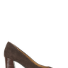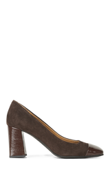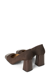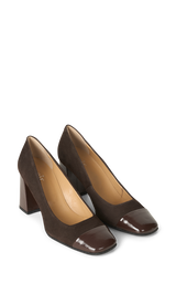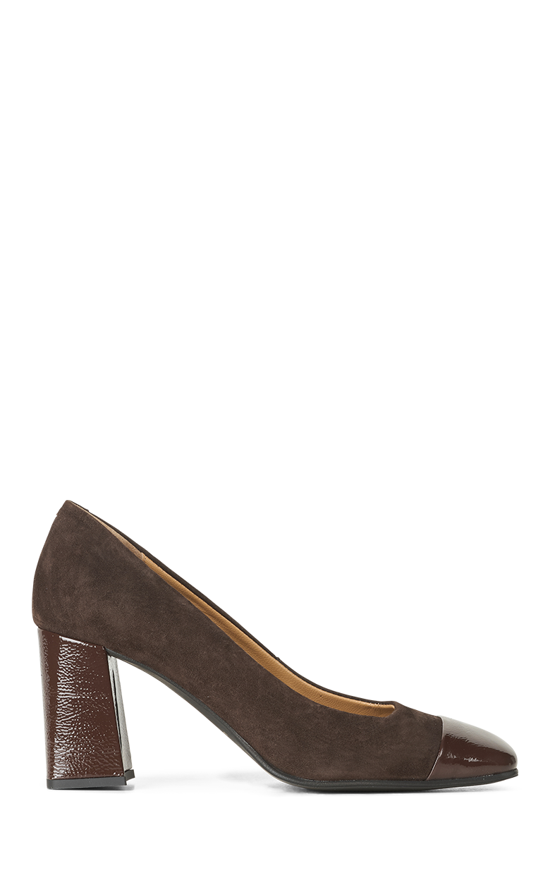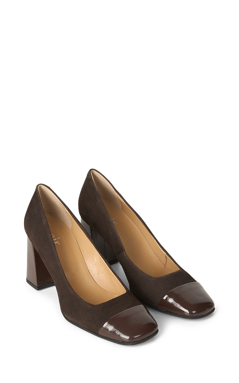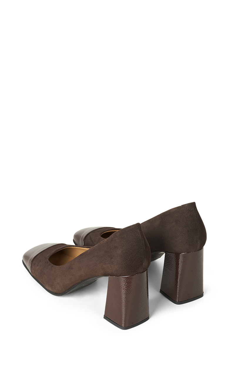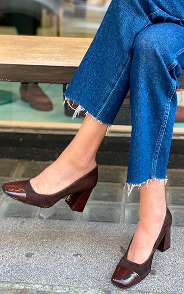 Smukke brune hæle i ruskind med lak snude og hæl.