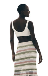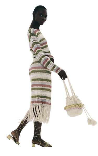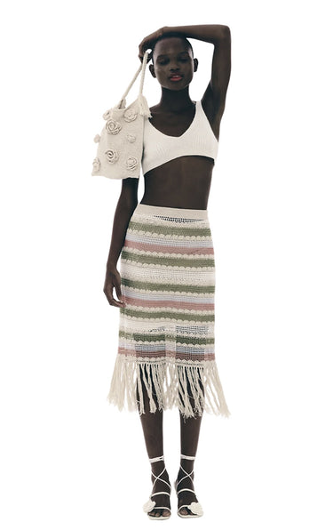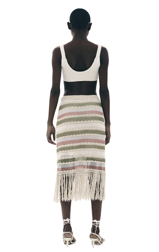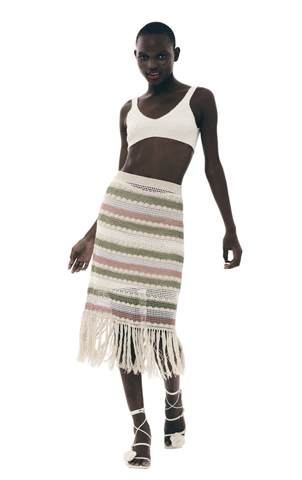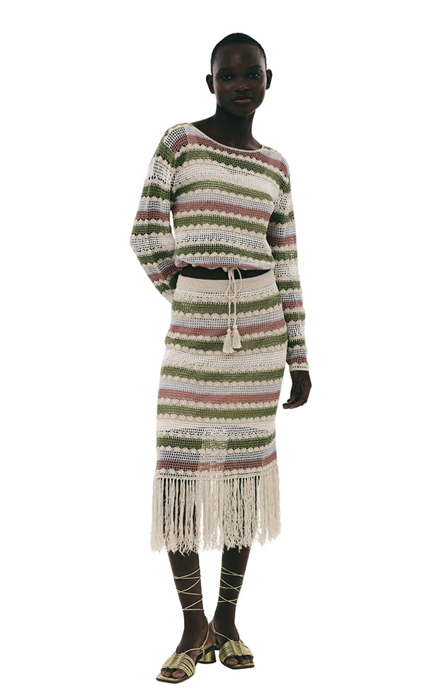 Smuk og farverig hæklet midi-nederdel med stripper og frynser, for og elastisk linning. Style med den matchende top for det komplette look.