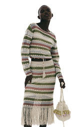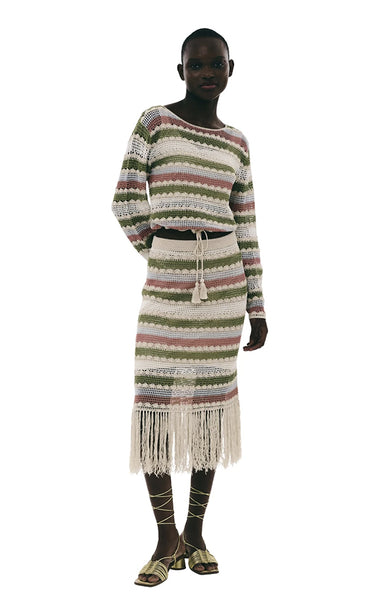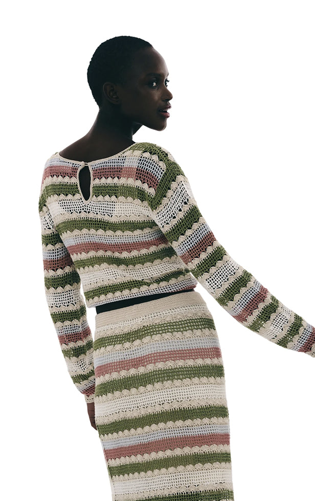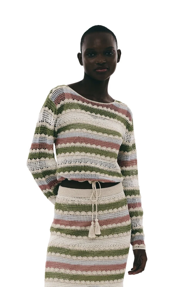 Smuk og farverig hæklet top med rund hals. Style med den matchende nederdel for det komplette look.