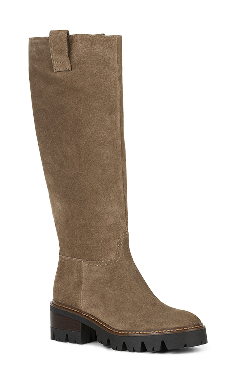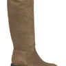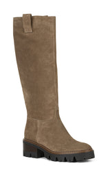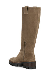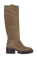Langskaftede chunky ruskind støvler i en lys grå/brun farve, lavet i smooth ruskind med en rund tå.