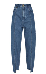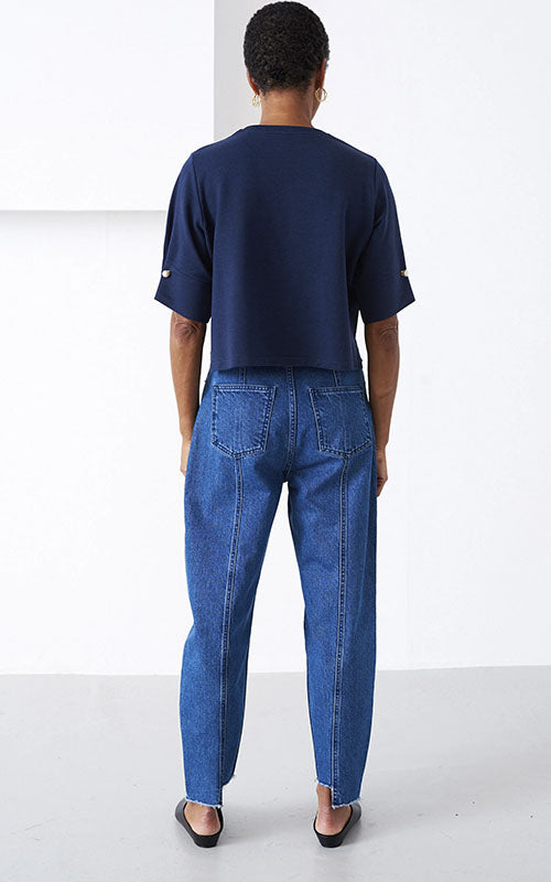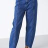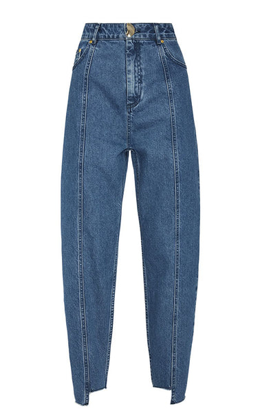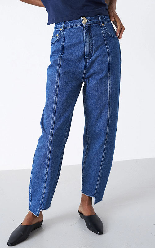 Introducerer Mother of Pearls nye genanvendte midwash-jeans. Sol har et tilspidset ben afsluttet med en asymmetrisk flosset søm og er afsluttet med et smukt guld nyrebeslag på knappen ved lynlåsem, Sol mellemvasken har en vintage vask og er lavet af 100% genbrugsbomuld.