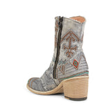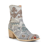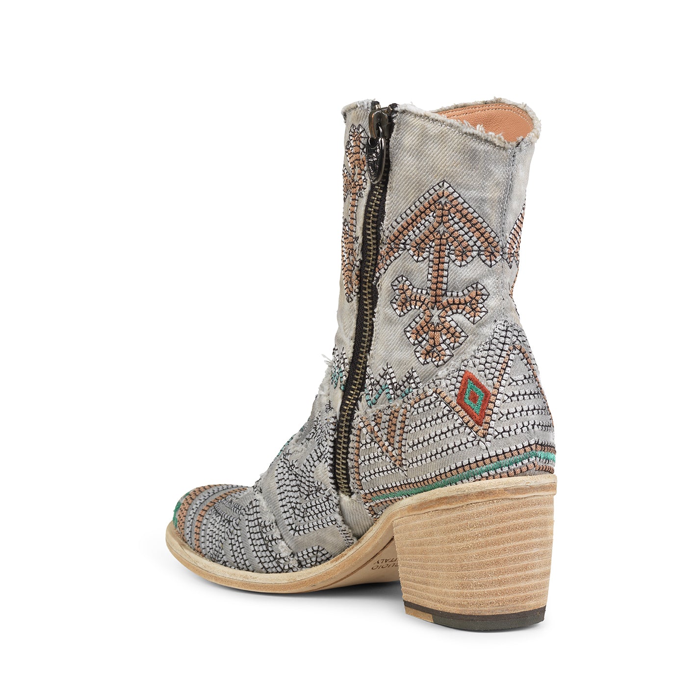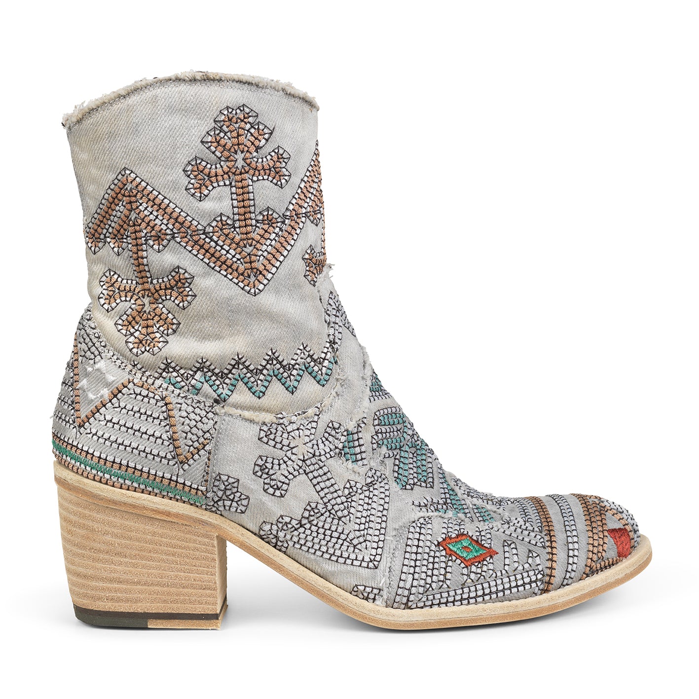 Utrolig ankelstøvle fra Fauzian Jeunesse i broderede og blegede sorte jeans, lædersål og træhæl dækket af læder, indvendig metal lynlås.